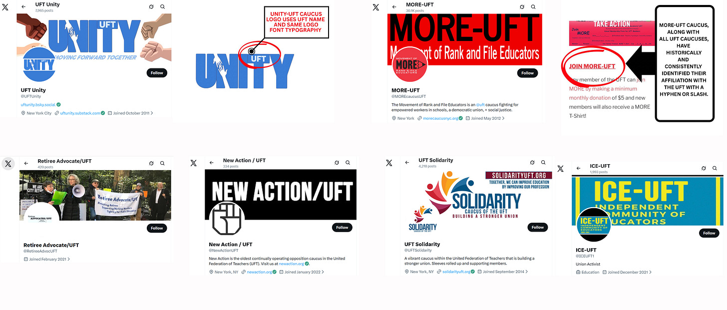 Unity UFT leadership chose to threaten its own members, using the dues we pay, rather than engage in conversation or debate. What makes this even more concerning is the long and well-documented history of other UFT slates and caucuses publicly using the UFT name in their titles, on their websites, in their email addresses, social media handles, and in their campaign materials. Unity Caucus has operated for decades using official-sounding names and imagery that mirror UFT branding — including in their logo using UFT typography. Other groups have done the same (e.g. MORE-UFT, RA/UFT, NAC-UFT, SOLIDARITY-UFT).