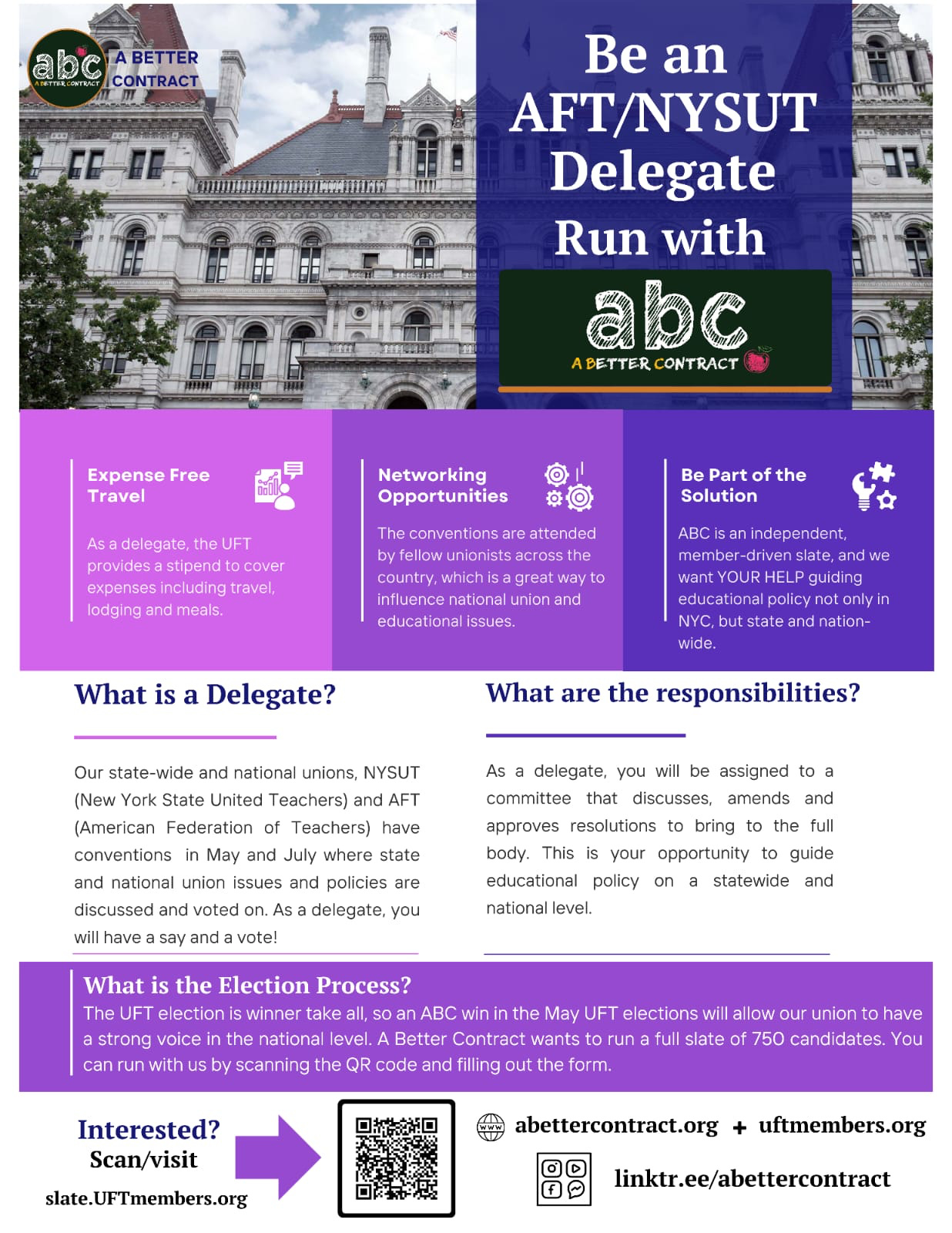 As you’ve probably heard by now, A Better Contract has finalized its officer and Executive Board slates. The last component we now need to fill is our slate of delegates for the AFT Convention and NYSUT Representative Assembly. We are asking for any interested UFT member to fill out the Google Form, below.
