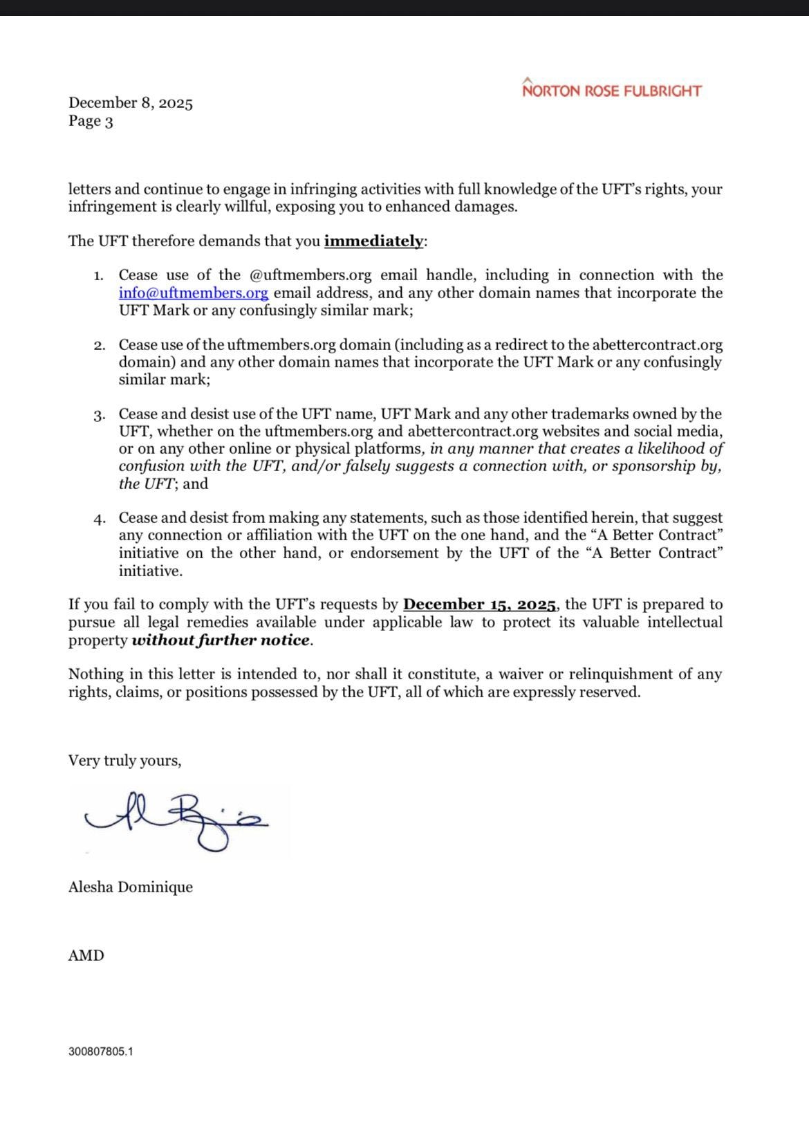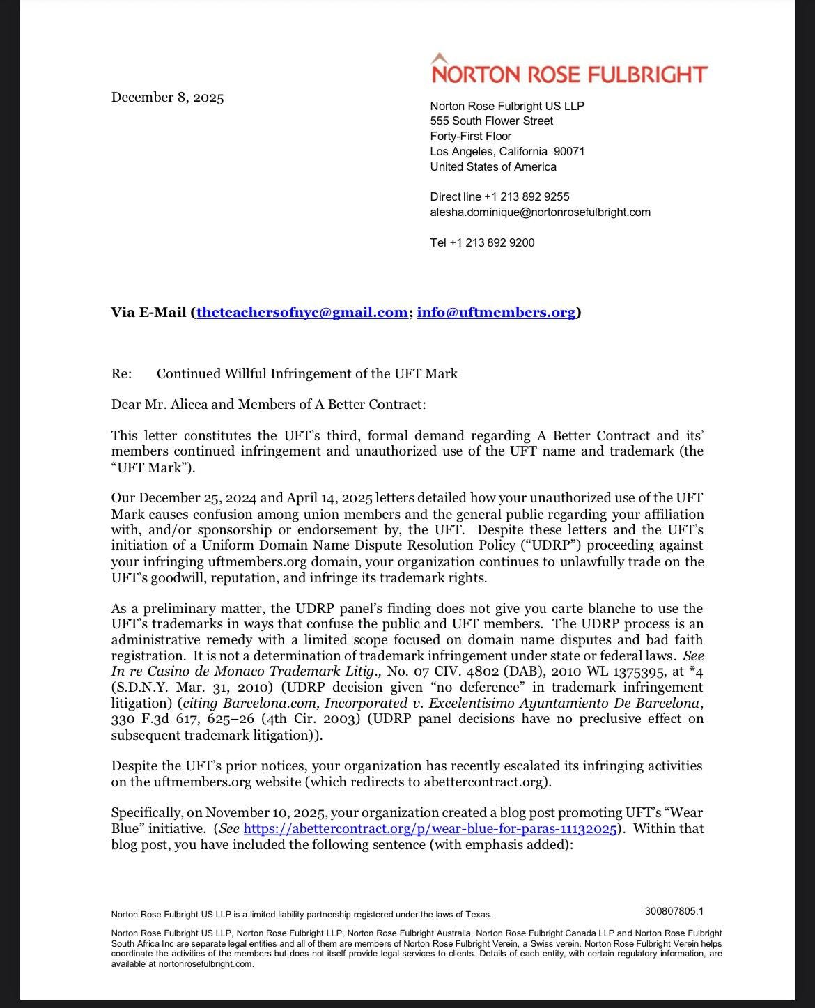 This is not the first time Mulgrew and Unity UFT have used our dues money to threaten UFT members. In June 2025, Unity UFT hired the same law firm to file a complaint accusing A Better Contract of infringement for referring to themselves as UFT members. That complaint was rejected by an independent arbitrator, who determined that ABC-UFT’s statement of being UFT members, which we are, is legitimate and protected.