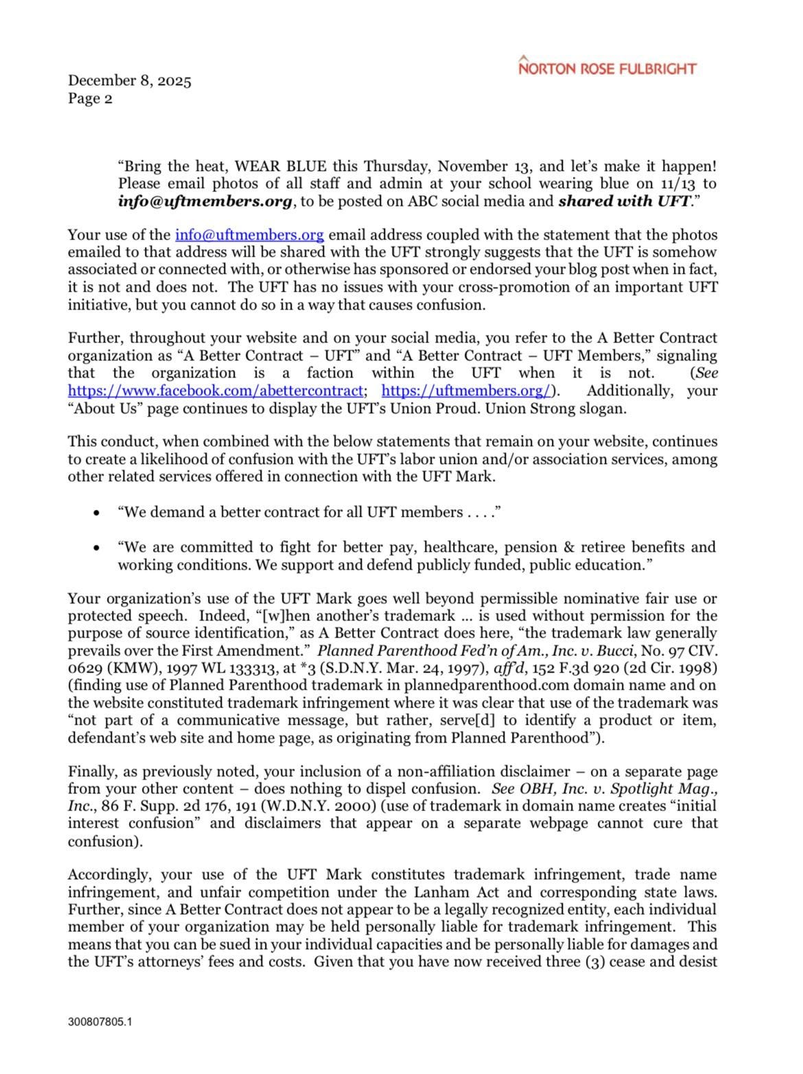 Michael Mulgrew and Unity UFT leadership, a political group that has controlled our union for more than sixty years and who continue to preside over diminishing returns for educators across the city, have hired the corporate law firm Norton Rose Fulbright to threaten legal action against A Better Contract (ABC-UFT). Their claim is that we, the committed educators and proud UFT members of ABC, do not have the right to refer to ourselves as UFT members.