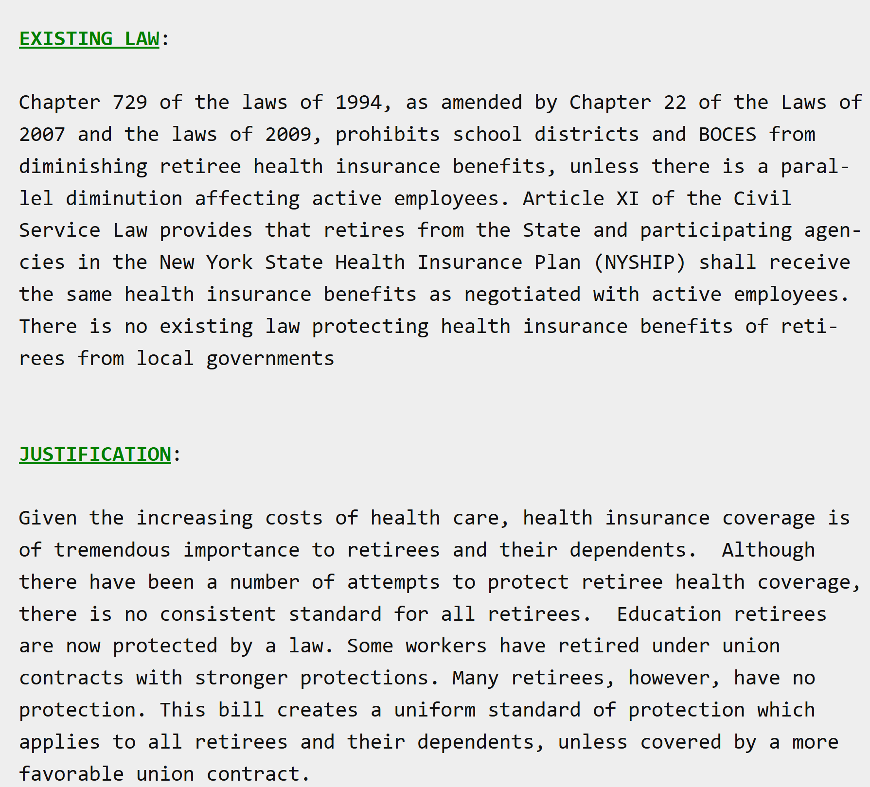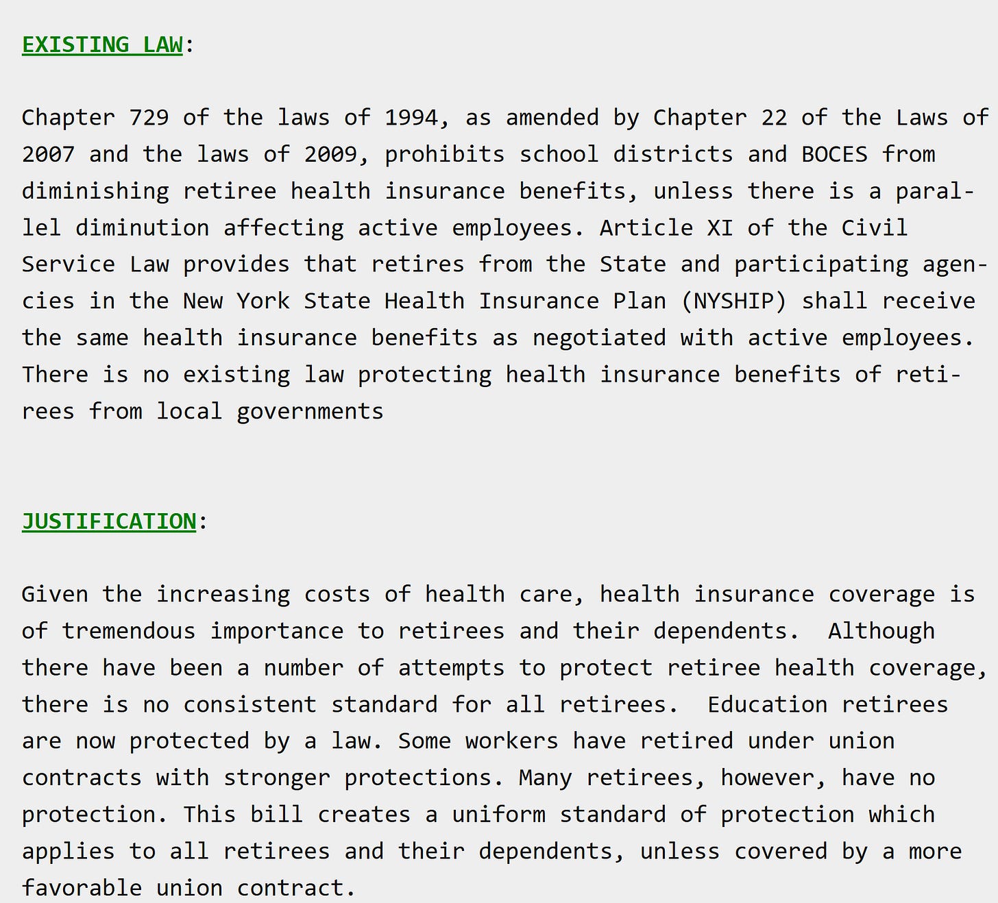 S3607 and Intro 1096 are not radical proposals. They’re basic protections—safeguards that have existed for 60+ years to ensure retirees aren’t pushed into second-rate healthcare plans they didn’t earn, don’t want, and can’t afford. Both of above bills protect a floor that has been in place for 60 years, no more no less.