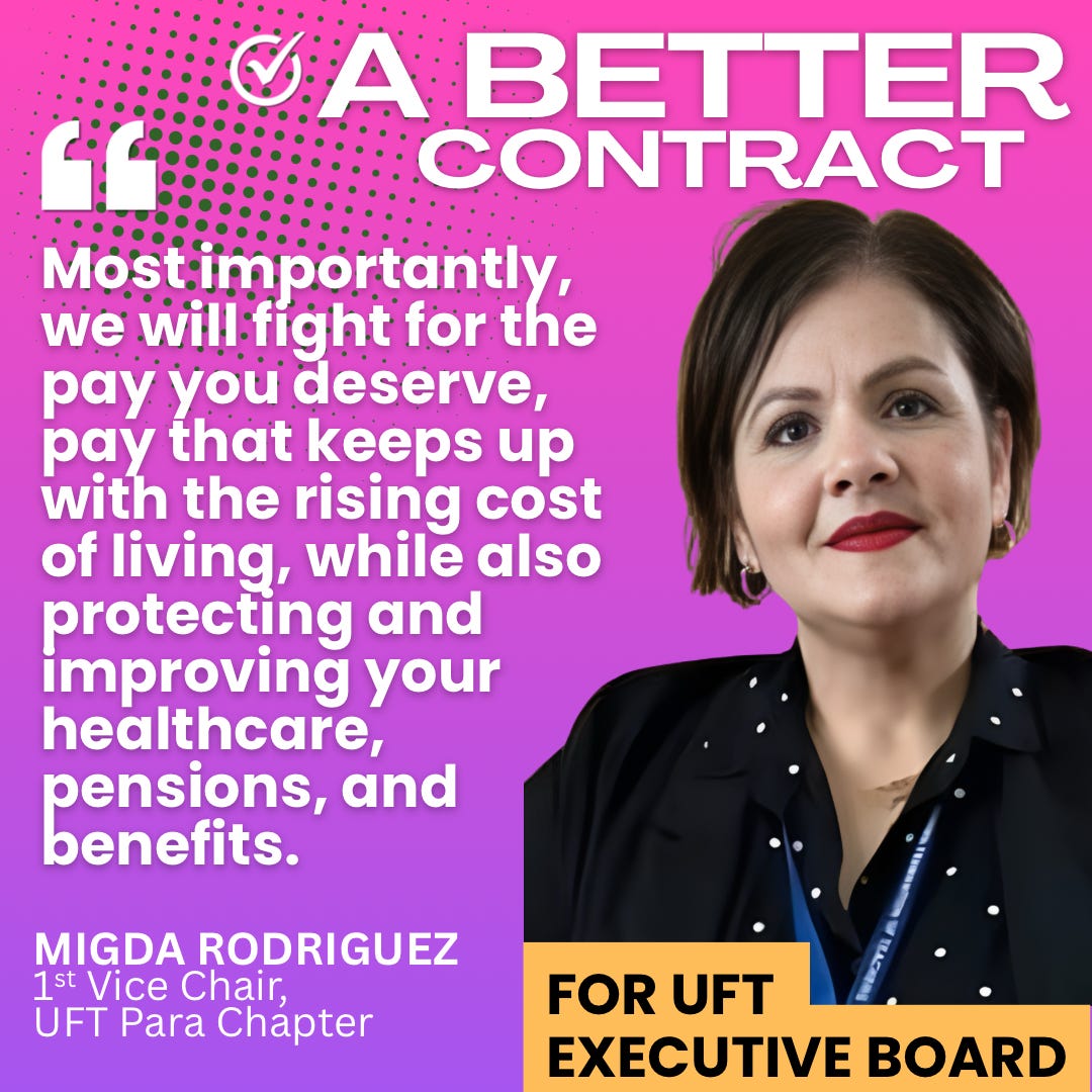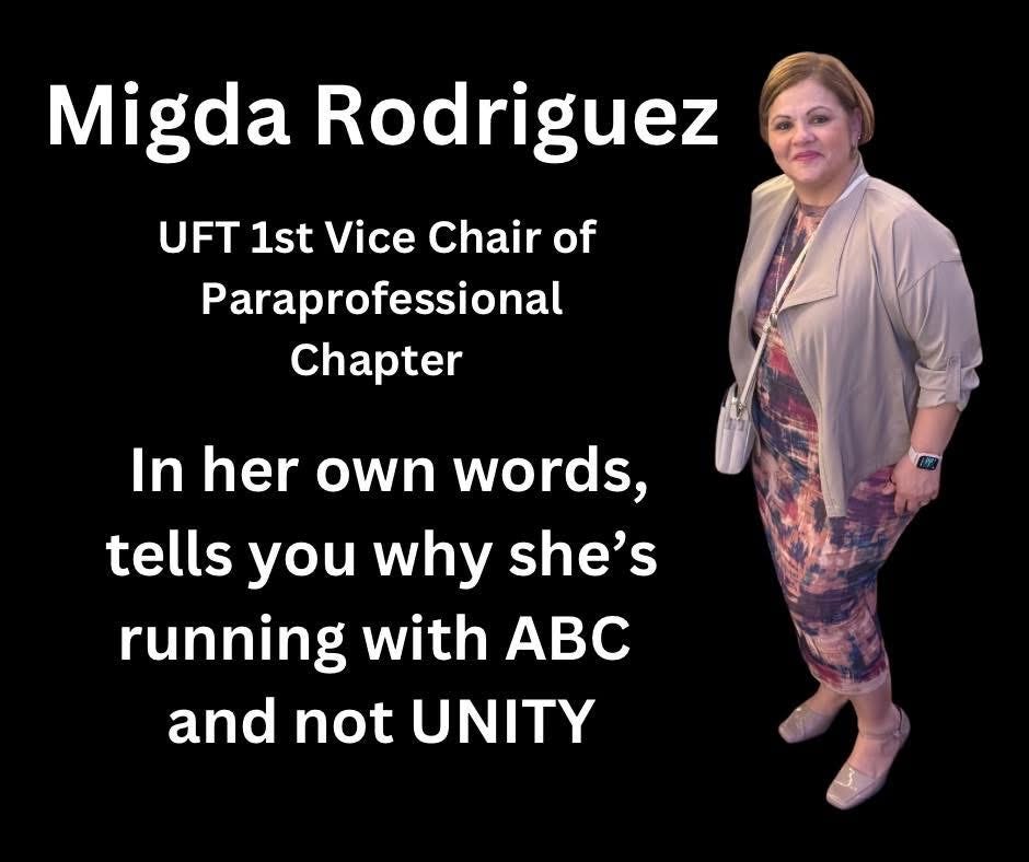 My name is Migda Rodriguez, a proud lifelong paraprofessional. I am also the elected 1st Vice Chair of the UFT Paraprofessional Chapter and I have chosen to run with the ABC slate because we stand for true union democracy, transparency, and accountability. Unlike UNITY, which thrives on silencing other opinions and ridiculing those who challenge them, ABC is committed to building a stronger, more responsive union that prioritizes its members over political games.